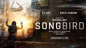 Le film Songbird est le premier réalisé à Los Angeles après la période de confinement contre l’épidémie de Covid de 2020. L’action se déroule en 2024 et se présente comme une projection dystopique de la situation présente, le virus ayant muté et étant devenu encore plus mortel. Les individus doivent se scanner tous les jours avec leur téléphone portable et s’ils sont positifs, une équipe vient les chercher pour les emmener de force dans des camps nommés Q-Zones. Les individus doivent pour la plupart rester chez eux, à l’exception des immunisés, qui portent un bracelet et qui peuvent circuler librement. Nico en fait partie, dans la mesure où il a été infecté dans le passé. Il est amoureux de Sara Garcia, dont la grand-mère est contaminée par le virus et finit par décéder. La brigade d’intervention est prévenue et se dirige vers la maison pour y récupérer le corps ainsi que Sara, pour la mener dans un camp. Ces derniers sont en fait de véritables mouroirs où les individus décèdent en général en 48 heures. Nico cherche à récupérer un laissez-passer, un bracelet délivré à toute personne immunisée et permettant de fuir les zones contaminées. Il s’adresse à des individus peu recommandables, qui les délivrent contre 150 000 dollars. Le chef des brigades d’intervention est un être corrompu, un ancien éboueur qui a profité du décès de tous ses supérieurs hiérarchiques, contaminés, pour prendre le pouvoir. Nico finit par obtenir le précieux sésame après avoir éliminé les escrocs. Il s’enfuit avec sa petite amie dans un lieu sans virus.