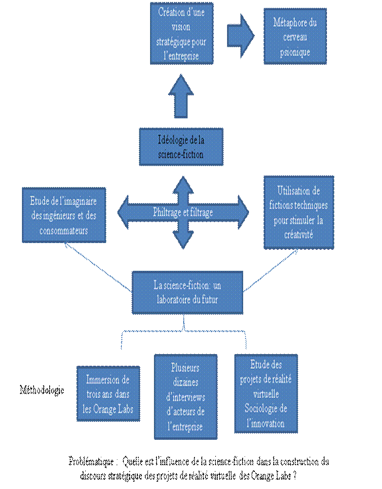 La science-fiction est un élément important dans l’élaboration des stratégies des grandes entreprises, notamment technologiques et de télécommunication. Cette thèse repose sur une enquête de terrain de plus de trois ans au sein des Orange Labs, et plus précisément dans les projets de réalité virtuelle de France Télécom R&D. L’objectif était de déterminer les différentes modalités d’utilisation de la science-fiction par les chercheurs, ingénieurs, scientifiques et managers de l’entreprise. Il en ressort, après plusieurs interviews dont les vingt plus importantes sont reportées en annexes, que la science-fiction est filtrée par l’entreprise pour inspirer les décideurs. Une idéologie de la science-fiction contribue à structurer le discours stratégique de l’entreprise, qui peut ainsi diffuser son discours auprès des marchés et de ses employés. Par ailleurs, un philtrage science-fictionnel, c’est-à-dire la création d’un philtre visant à charmer les acteurs et reposant sur la science-fiction structure la stratégie de l’entreprise. La science-fiction, notamment cyberpunk, a beaucoup contribué à diffuser des représentations de technologies utopiques auprès des ingénieurs et des managers qui ont investi pour réaliser ces visions. La science-fiction constitue aussi une culture commune aux décideurs du capitalisme global. Elle a beaucoup contribué à structurer les visions innovantes en proposant des fictions avant-gardistes aux innovateurs durant le vingtième siècle. Les Orange Labs développent de nombreuses méthodes pour exploiter au mieux le potentiel innovant de ce genre artistique.